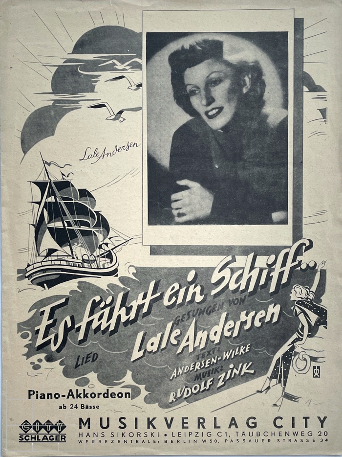 vö. 1941 City Noten(Akkordeon/Gesang) [C. 25153] Es fährt ein Schiff... Gesungen von Lale Andersen. Musikverlag City, Hans Sikorski: Leipzig 1941. Es fährt ein Schiff zum Hafen raus Akkordeon-Ausgabe, einfarbig [ggf. sonstige Bemerkungen]