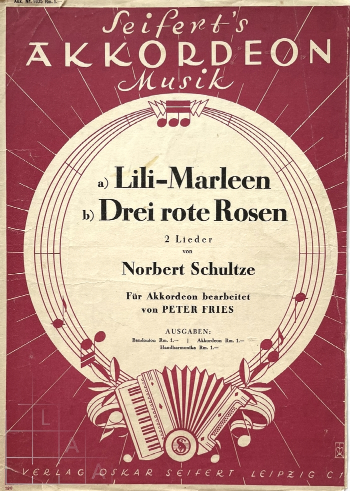 [1835] a) Lili Marleen. b) Drei rote Rosen. 2 Lieder von Norbert Schultze. Für Akkordeon bearbeitet von PETER FRIES. Verlag Oskar Seifert: Leipzig 1940.
