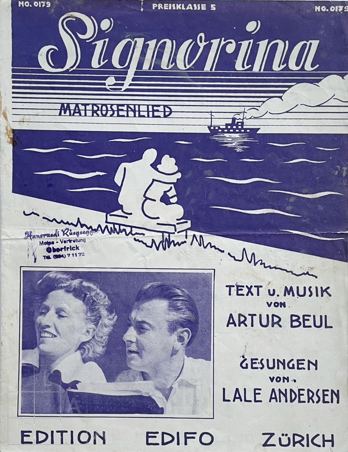 vö. 1950 Edition Edifo Noten(Klavier/Gesang) [0179] Signorina. Matrosenlied. Gesungen von Lale Andersen. Edition Edifo: Zürich 1950. Signorina [ggf. Bemerkungen] [ggf. sonstige Bemerkungen]